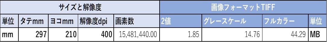 A4、400dpiの場合、表で示すと次のようにまとまります。