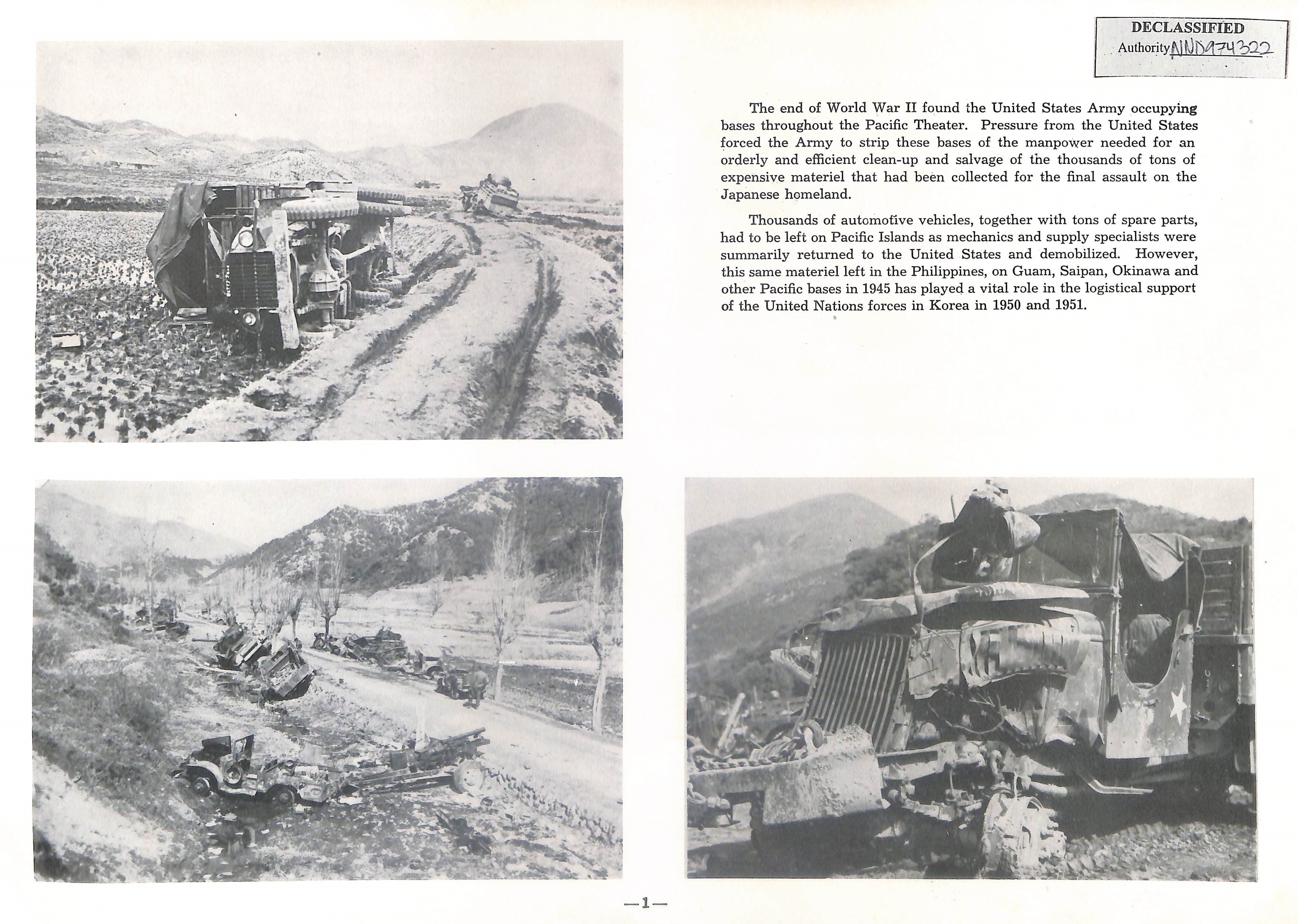 上記のページは巻頭の言葉に続く、写真の第1ページとなり、その説明文には、第二次世界大戦の終結した時点で、米軍は太平洋戦域全域の旧日本軍の基地を占領していた事、当初、本土決戦用に集積していた数千トンに及ぶ高価な資材の撤去及び回収を戦後に行う計画であったが、米兵達は、本国帰還となり、そのためにそれらの資材はそのまま各地にを放置せざるを得なかった事、しかしながら、朝鮮戦争勃発後はそれらの資材の内、特に数千台の自動車と数トンの予備部品については、国連軍の兵站支援において極めて重要な役割を果たすことになった事などが書かれています。