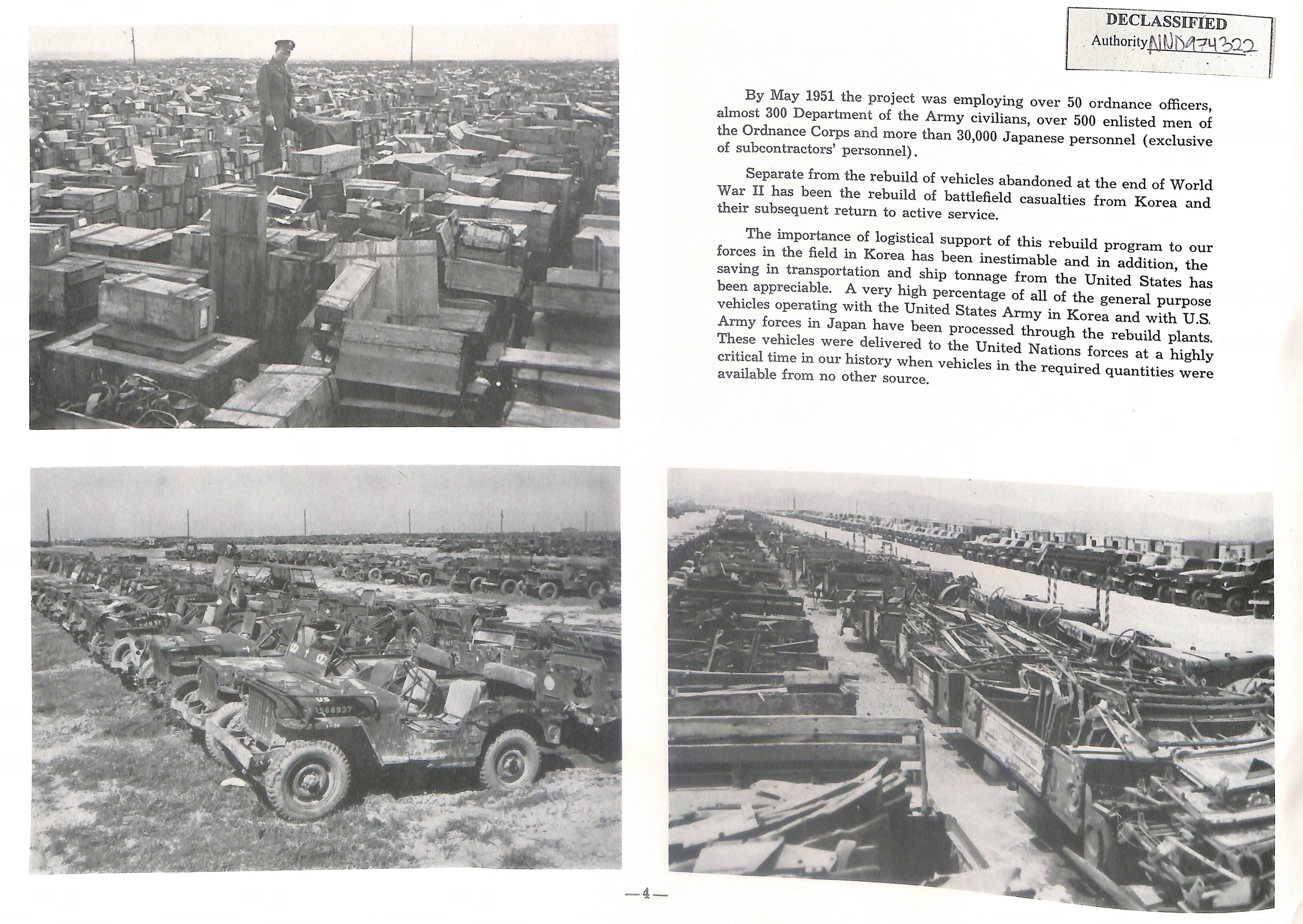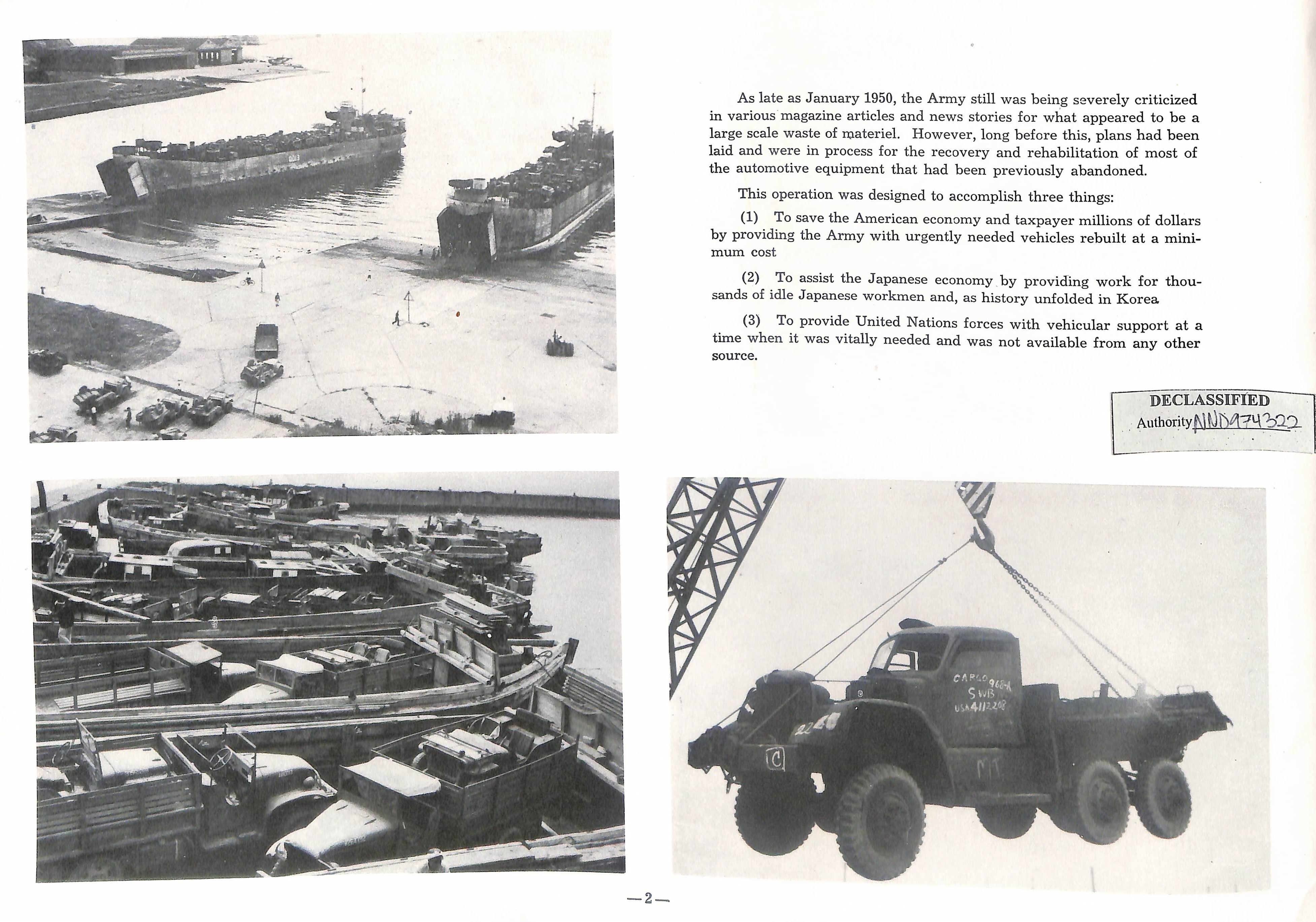 さらに続く、写真ページでは、朝鮮半島において、米軍に緊急に必要な車両を最低限のコストで再整備をして提供し、米国内の税を節約をすることができた事、また、朝鮮半島での新たな歴史の展開に伴い、戦後において失業していた日本人への仕事の提供を通じて日本経済を支援することができた事、さらには、国連部隊に対し、極めて必要とされながらも他から入手できなかった時期に車両支援を提供する事ができた事なども書かれていました。