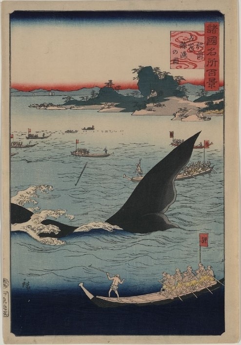 | 諸国名所百景肥前五島鯨漁の図。歌川広重。Hizen gotō kujiraryō no zu. Whale hunting at the island of Goto in Hizen. Whalers armed with harpoons hunting whales. Utagawa, Hiroshige, 1826-1869. Digital Id: jpd 01790 //hdl.loc.gov/loc.pnp/jpd.01790. Library of Congress Control No. 2002700001, Library of Congress, Washinton, DC. https://www.loc.gov/resource/jpd.01790/ |