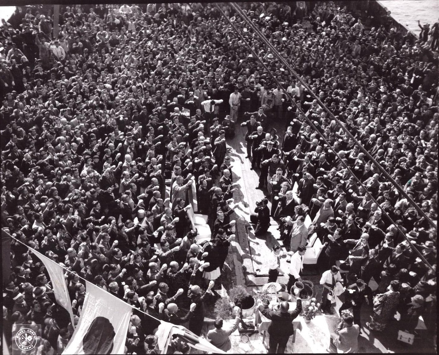 下の2枚の写真は、1947年11月の2回目の南氷洋へ出漁する時の横須賀での盛大な壮行会の様子と第一日新丸の出航時のものです。6か月間捕鯨作業に従事しました。